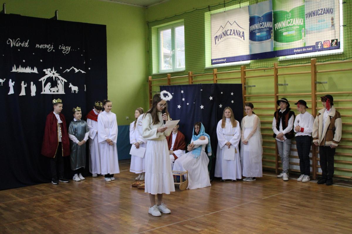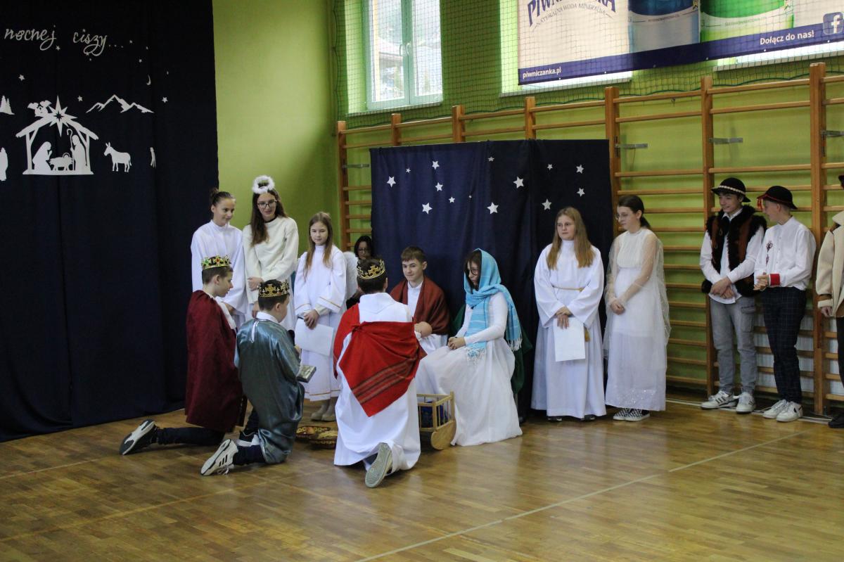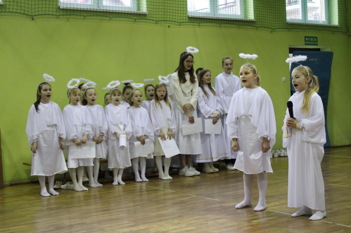 Następnie młodzież przedstawiła najważniejsze wydarzenia z narodzin Pana Jezusa. Całość uświetnił śpiew kolęd, które przepięknie brzmiały w wykonaniu uczennic klas I-III.