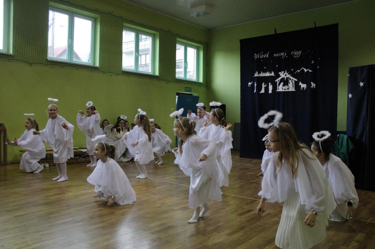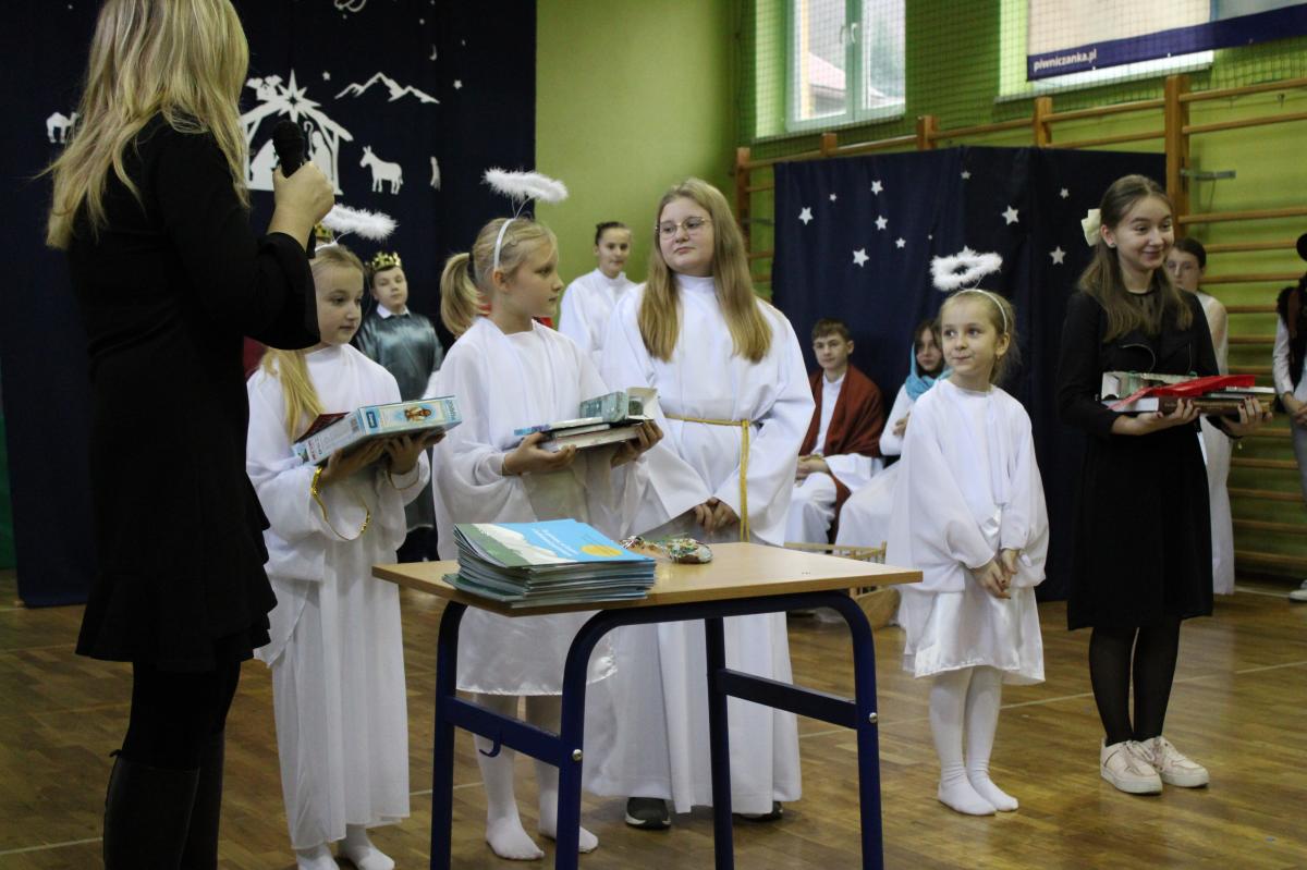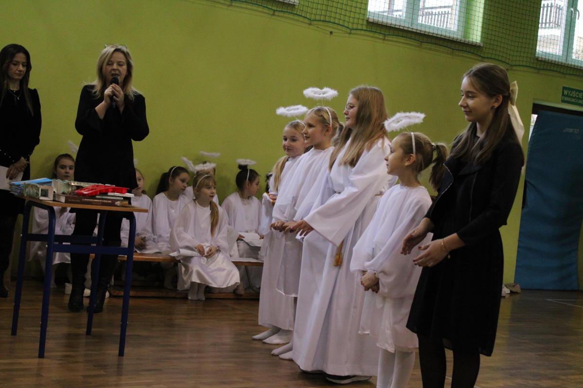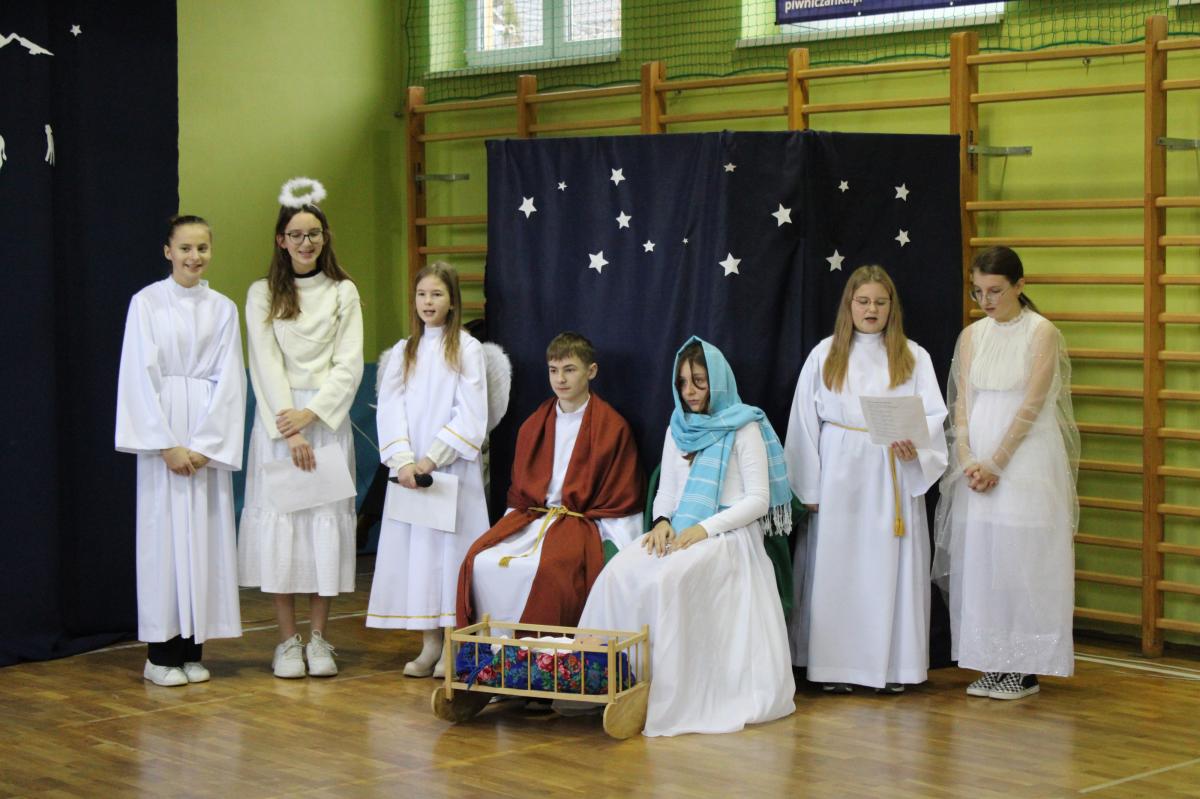 Następnie młodzież przedstawiła najważniejsze wydarzenia z narodzin Pana Jezusa. Całość uświetnił śpiew kolęd, które przepięknie brzmiały w wykonaniu uczennic klas I-III.