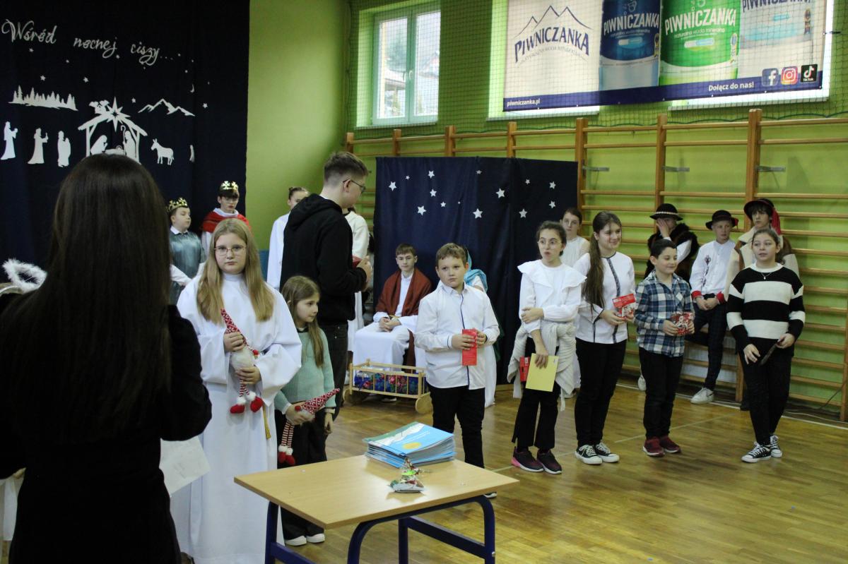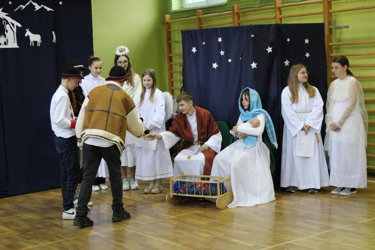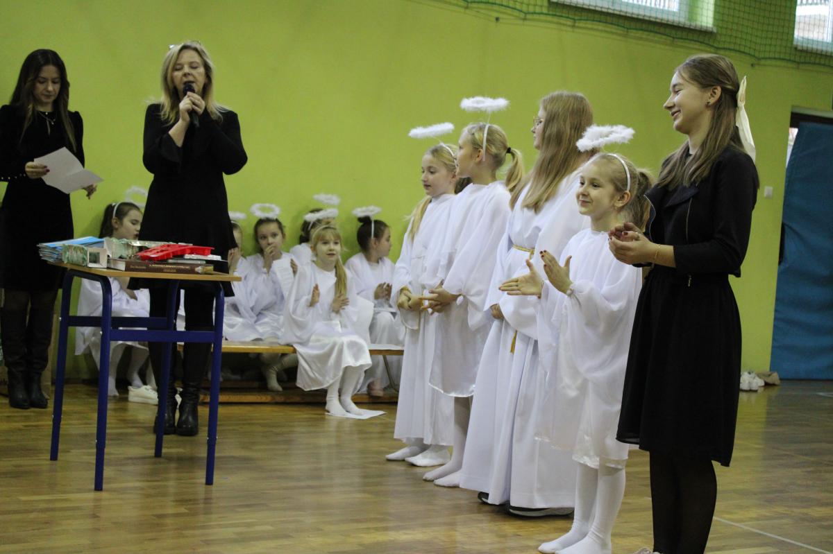 Uroczystość rozpoczęliśmy od obejrzenia przedstawienia jasełkowego w wykonaniu uczniów klas VI i VII oraz uczennic klas I-III.